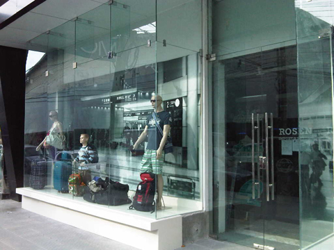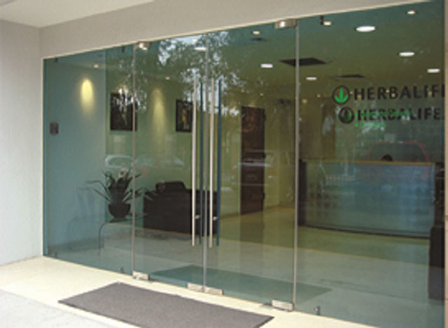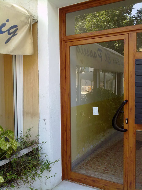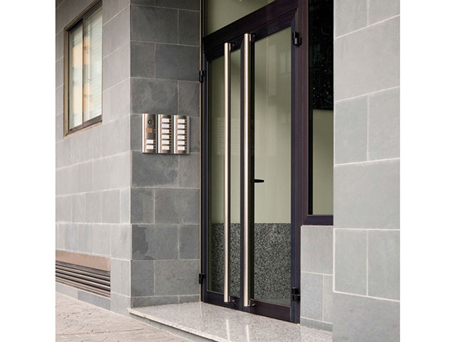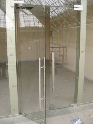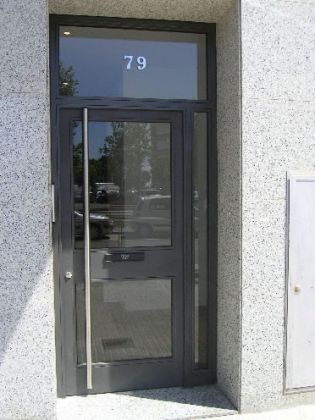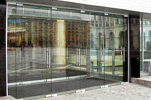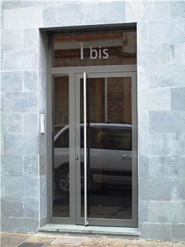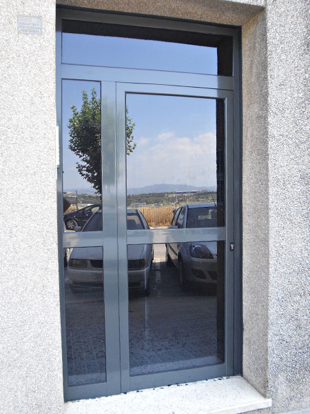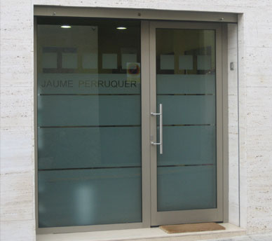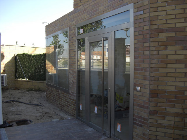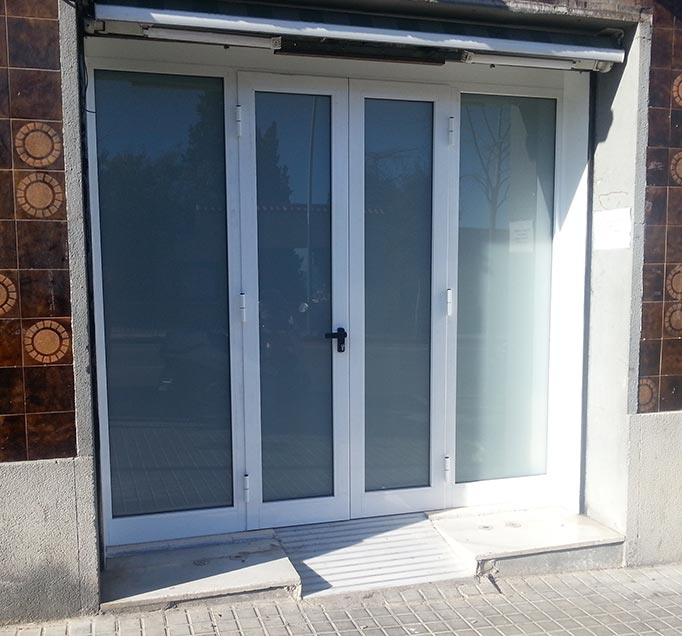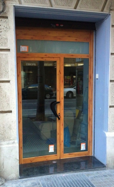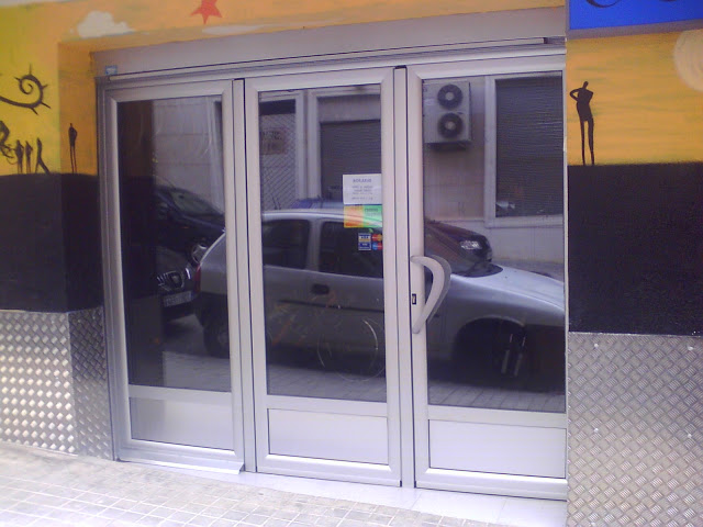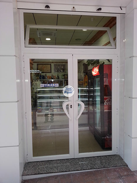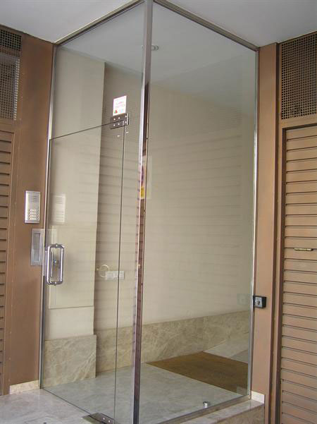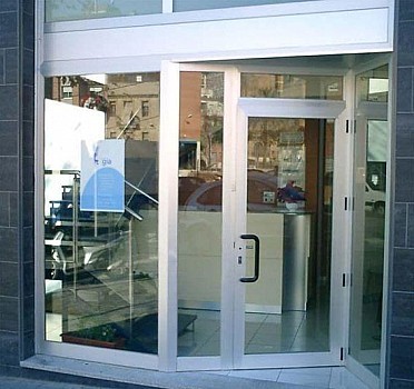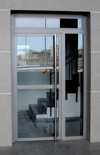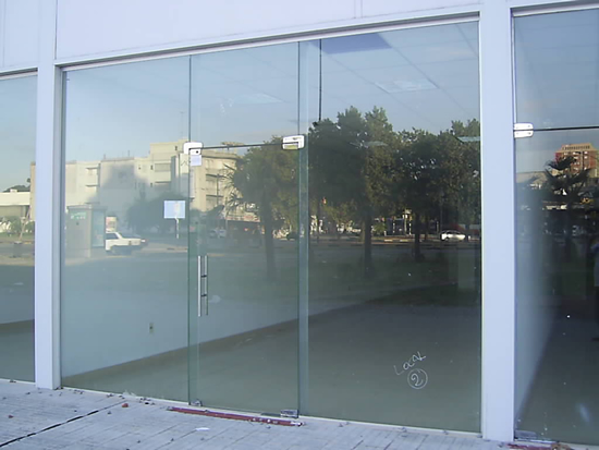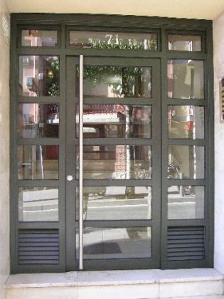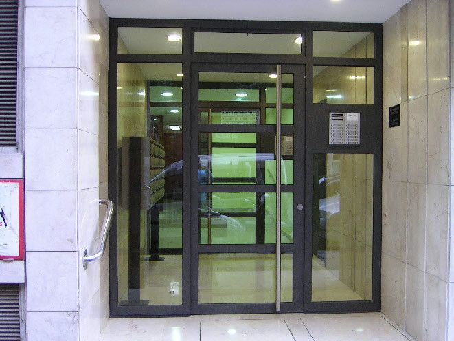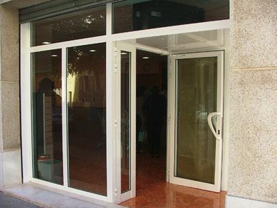Las puertas de entrada de tiendas y comercios pueden ser de aluminio y cristal o de cristal de seguridad templado con perfiles de acero inoxidable.